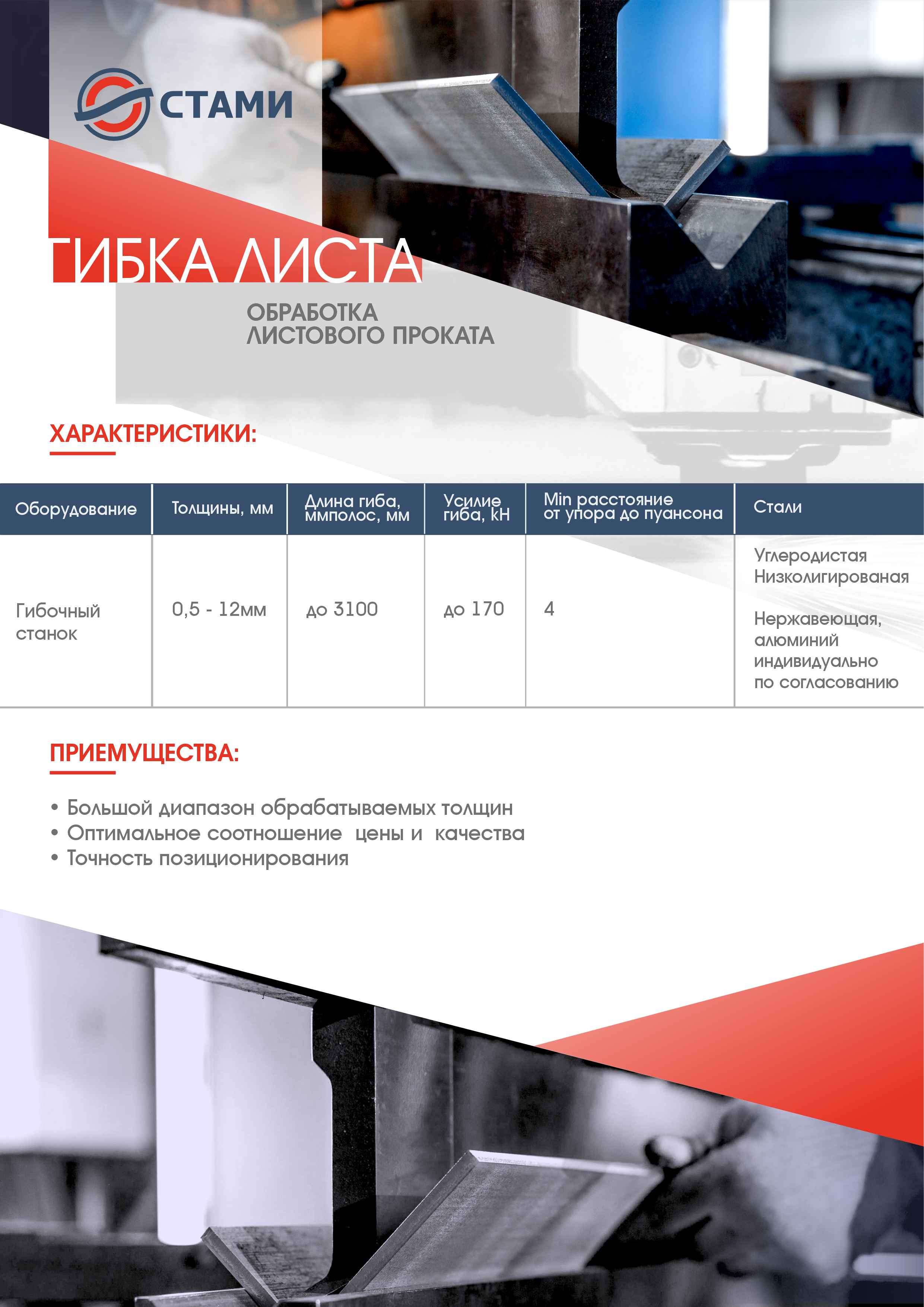 Таким образом, СМЦ «Стами» осуществляет раскрой холоднокатаного листа конструкционных марок сталей, в том числе оцинкованный и с лакокрасочным полимерным покрытием толщиной от 0,3 до 2 мм и длиной от 300 до 4000мм.